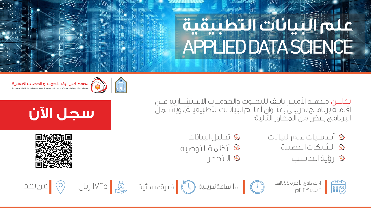 إيمانًا بأهمية البيانات ودورها في تعزيز الاقتصاد الرقمي، يسرُ معهد الأمير نايف للبحوث والخدمات الاستشارية أن يعلن عن إقامة برنامج تدريبي بعنوان (علم البيانات التطبيقية)، وسينفذ البرنامج (عن بعد) في يوم الاثنين 9 جمادى الآخرة 1444هـ الموافق 2 يناير 2023م، ويستمر لمدة (8 أسابيع) ،