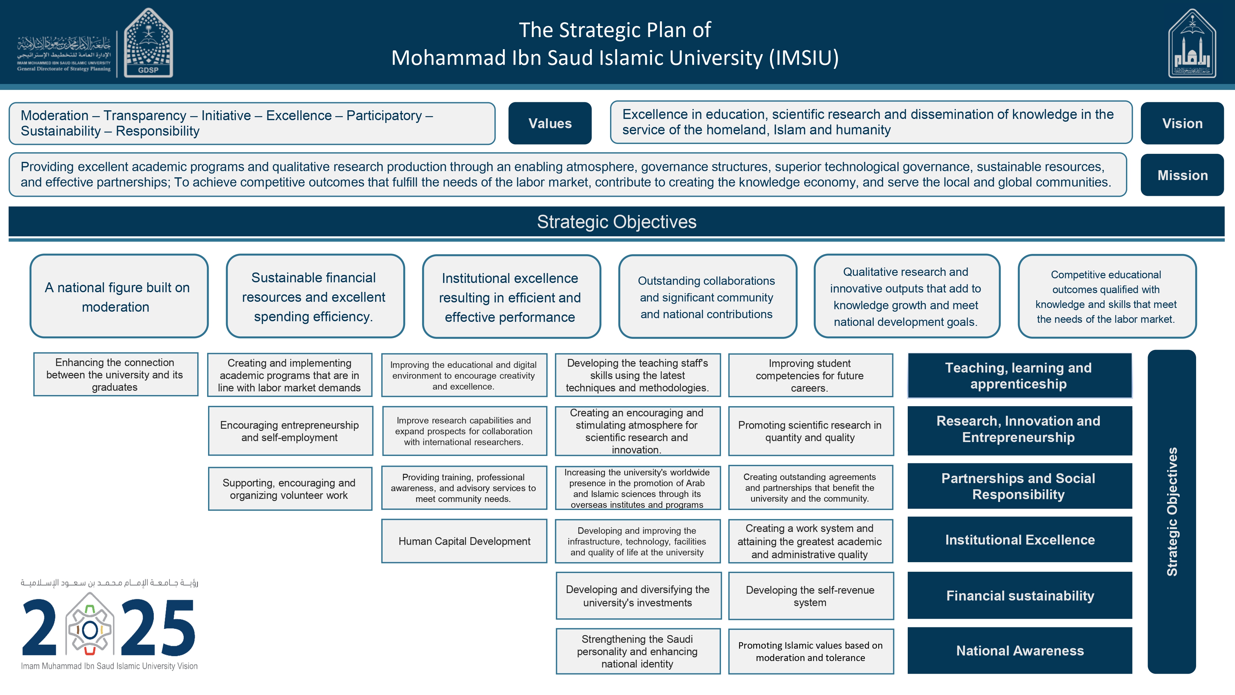 Aiming to develop its vision and mission to conform to the aspirations of the wise leadership and the Saudi Vision 2030, the university has launched its new strategic plan 2021-2025.The plan seeks to provide outstanding academic programs and research production, through a stimulating environment, governance systems, advanced technology, sustainable resources and effective partnerships; in order to achieve competitive outcomes that meet the needs of the labour market and contribute in developing the national economy and serving the community. The University's strategic plan focused on six main areas:
