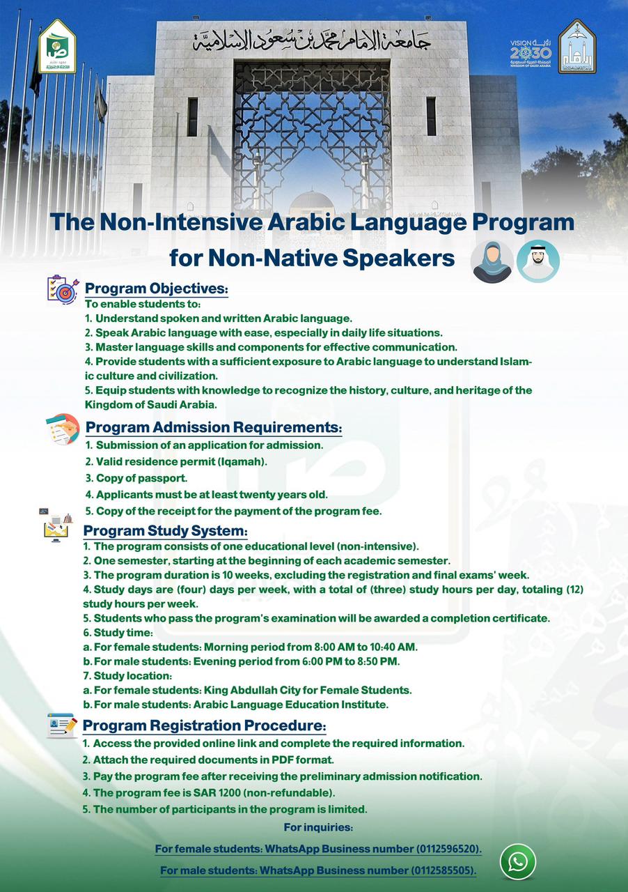ينظم معهد تعليم اللغة العربية بجامعة الإمام محمد بن سعود الإسلامية (البرنامج اللغوي غير المكثف لتعليم اللغة العربية للناطقين بغيرها) للدارسين والدراسات، وينتهي التقديم يوم الخميس 15-2-1445هـ الموافق 31-8-2023م